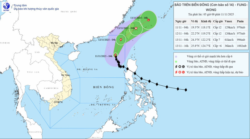 Hồi 4 giờ ngày 11/11, vị trí tâm bão ở vào khoảng 19,3 độ Vĩ Bắc; 118,1 độ Kinh Đông, trên vùng biển phía Đông khu vực Bắc Biển Đông. Sức gió mạnh nhất vùng gần tâm bão mạnh cấp 12 (118-133km/giờ), giật cấp 15. Di chuyển theo hướng Bắc Tây Bắc, tốc độ khoảng 10km/h.