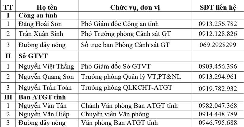 Các số điện thoại trong đường dây nóng đã được Ban ATGT thống nhất với Công an tỉnh và Sở GTVT, nhằm tiếp nhận, kịp thời xử lý các phản ánh của người dân về tình hình bảo đảm trật tự, ATGT trong dịp nghỉ lễ và thời gian tiếp theo.