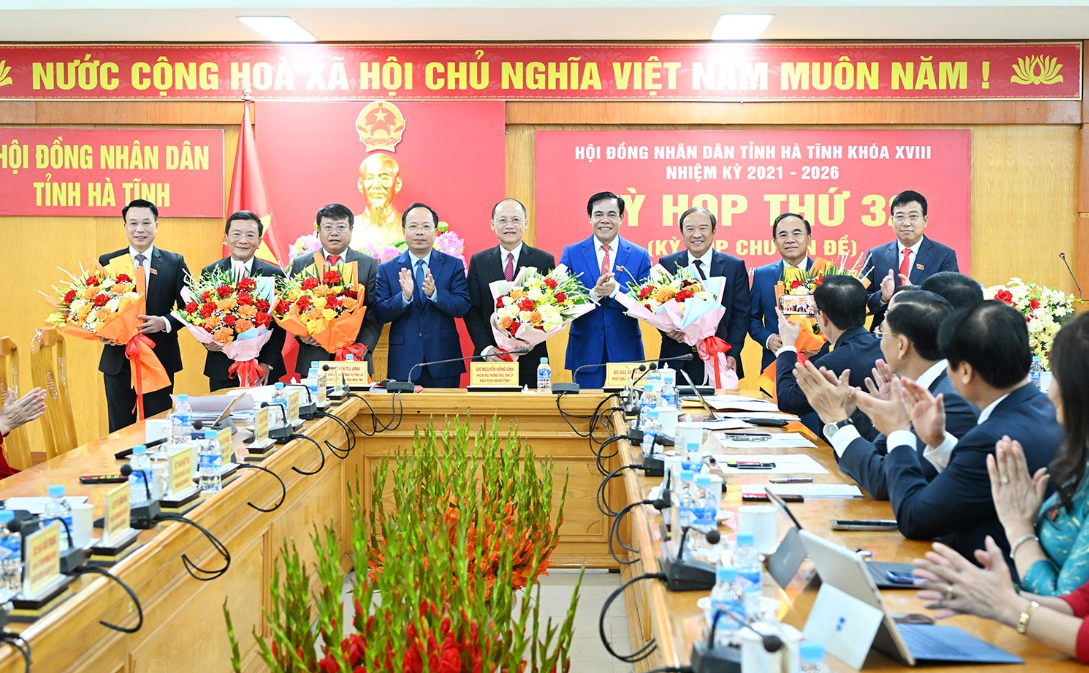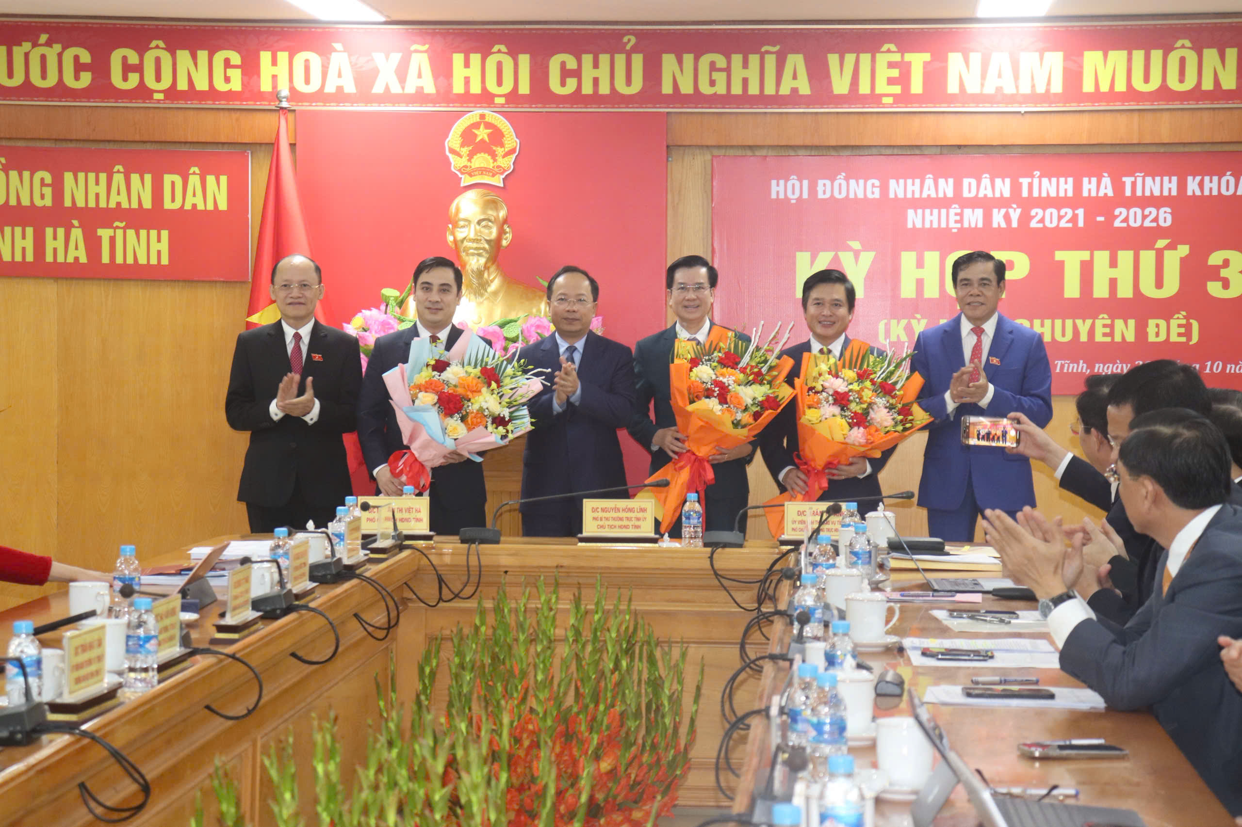 Bí thư Tỉnh ủy Nguyễn Duy Lâm, Phó Bí thư Thường trực Tỉnh ủy Nguyễn Hồng Lĩnh và Chủ tịch UBND tỉnh Võ Trọng Hải tặng hoa chúc mừng Chánh Văn phòng UBND tỉnh Trần Viết Hải, Giám đốc Sở Khoa học và Công nghệ Lê Thành Đông, Chánh Thanh tra tỉnh Nguyễn Thanh Điện được bầu bổ sung các Ủy viên UBND tỉnh.