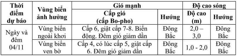 Ngoài ra, ngày và đêm 4/11, vùng biển Hà Tĩnh có mưa rào và dông rải rác. Trong mưa dông có khả năng xảy ra lốc xoáy, gió giật mạnh. Ngày và đêm 5/11, gió trên vùng biển Hà Tĩnh giảm dần.